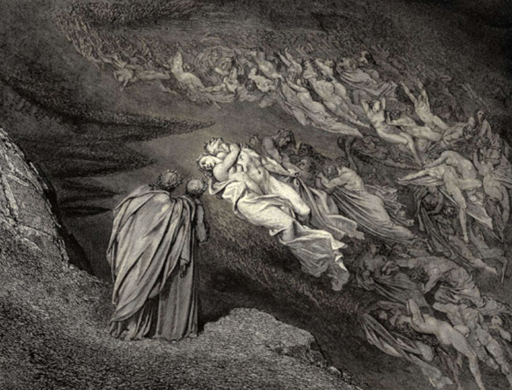 Dante and Virgil start in the second circle of hell. Here they find Minos sitting examining each lost soul that arrives. He wraps his tail around himself a certain number of times, to indicate which level of hell the sinner belongs. Minos lets them pass, and Dante and Virgil come to a whirlwind of lustfull souls. Virgil recognizes many of the souls including Semiramis, Dido, Cleopatra, Helen, Achilles, Paris, and Tristan.Dante notices Francesca and Paolo.