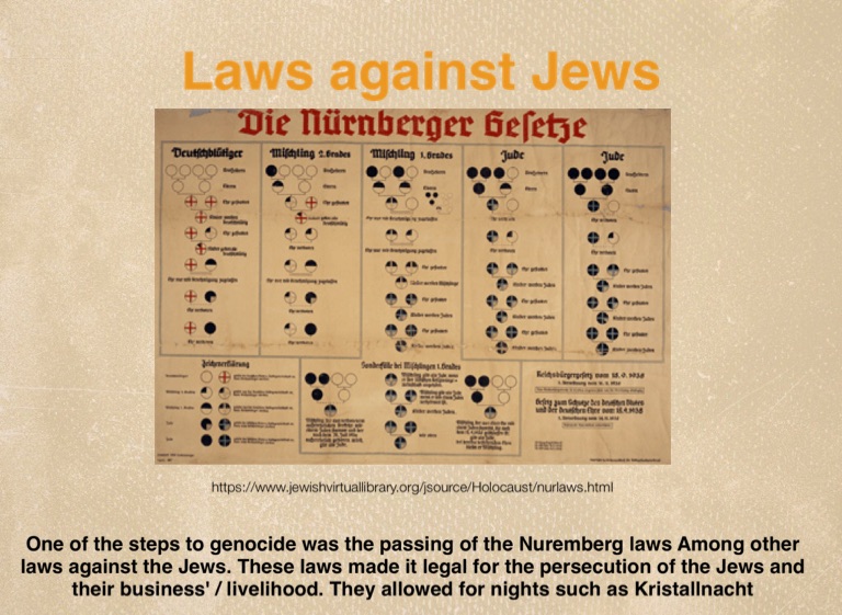 One of the steps to genocide was the passing of the Nuremberg laws Among other laws against the Jews. These laws made it legal for the persecution of the Jews and their business' / livelihood. They allowed for nights such as Kristallnacht