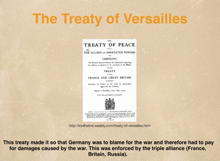 This treaty made it so that Germany was to blame for the war and therefore had to pay for damages caused by the war. This was enforced by the triple alliance (France, Britain, Russia).