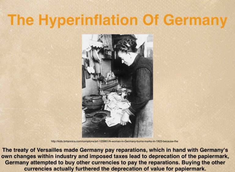 The treaty of Versailles made Germany pay reparations, which in hand with Germany's own changes within industry and imposed taxes lead to deprecation of the papiermark, Germany attempted to buy other currencies to pay the reparations. Buying the other currencies actually furthered the deprecation of value for papiermark.