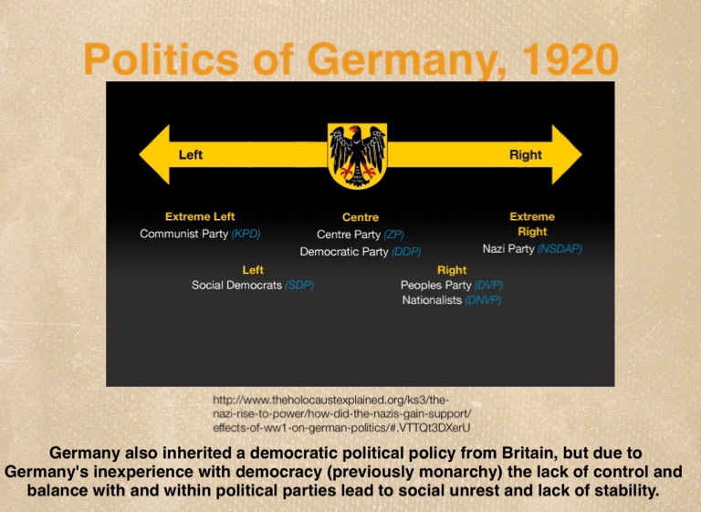 Germany also inherited a democratic political policy from Britain, but due to Germany's inexperience with democracy (previously monarchy) the lack of control and balance with and within political parties lead to social unrest and lack of stability.