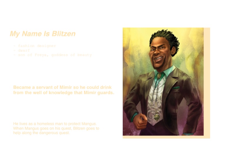 He lives as a homeless man to protect Mangus. When Mangus goes on his quest, Blitzen goes to help along the dangerous quest.