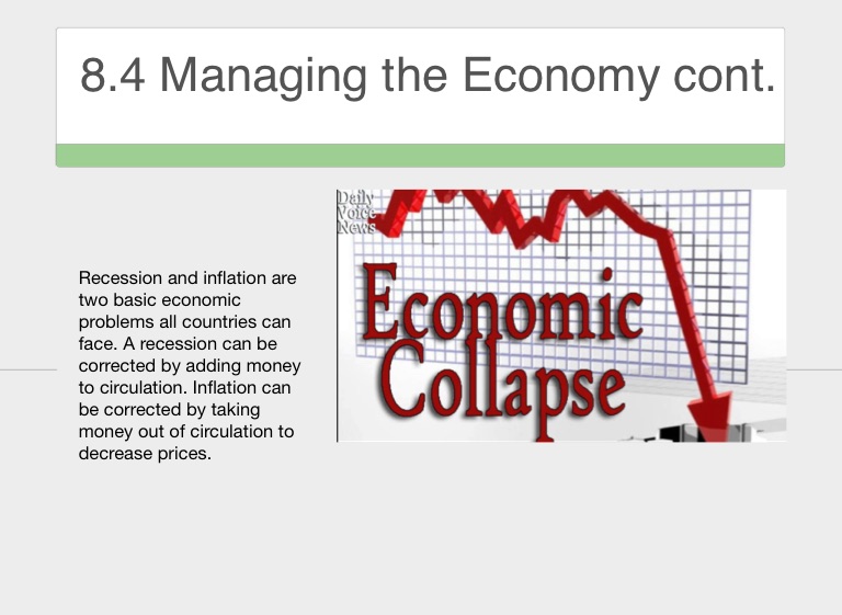 Recession and inflation are two basic economic problems all countries can face. A recession can be corrected by adding money to circulation. Inflation can be corrected by taking money out of circulation to decrease prices.