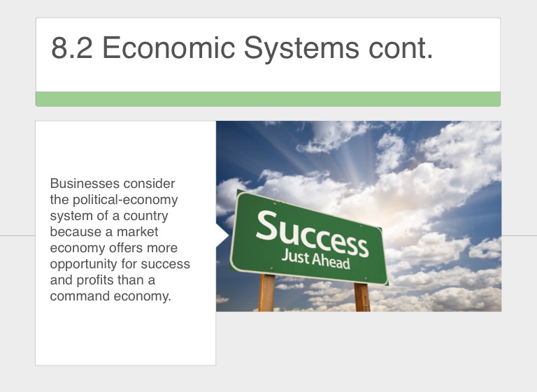 Businesses consider the political-economy system of a country because a market economy offers more opportunity for success and profits than a command economy.
