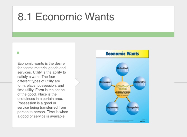Economic wants is the desire for scarce material goods and services. Utility is the ability to satisfy a want. The four different types of utility are form, place, possession, and time utility. Form is the shape of the good. Place is the usefulness in a certain area. Possession is a good or service being transferred from person to person. Time is when a good or service is available.