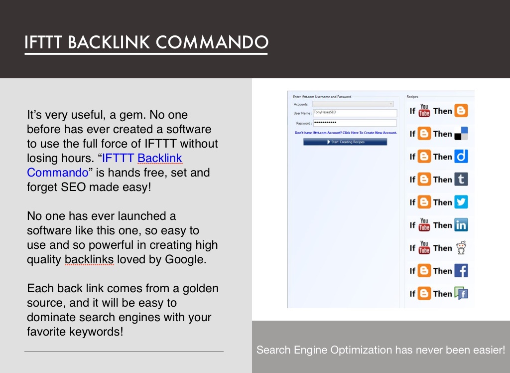 It’s very useful, a gem. No one before has ever created a software to use the full force of IFTTT without losing hours. “IFTTT Backlink Commando” is hands free, set and forget SEO made easy!
