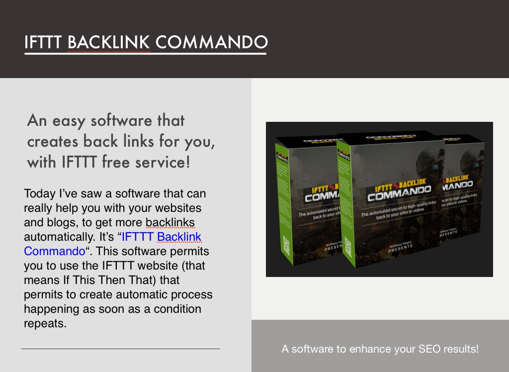 Today I’ve saw a software that can really help you with your websites and blogs, to get more backlinks automatically. It’s “IFTTT Backlink Commando“. This software permits you to use the IFTTT website (that means If This Then That) that permits to create automatic process happening as soon as a condition repeats.