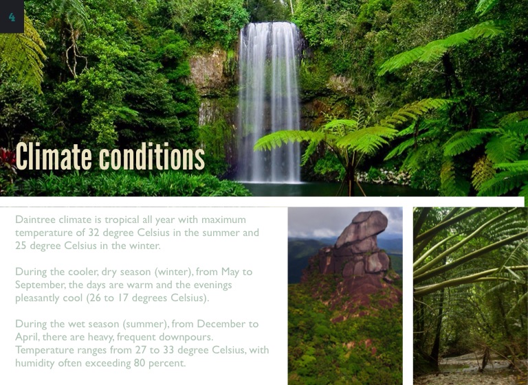 Daintree climate is tropical all year with maximum temperature of 32 degree Celsius in the summer and 25 degree Celsius in the winter.