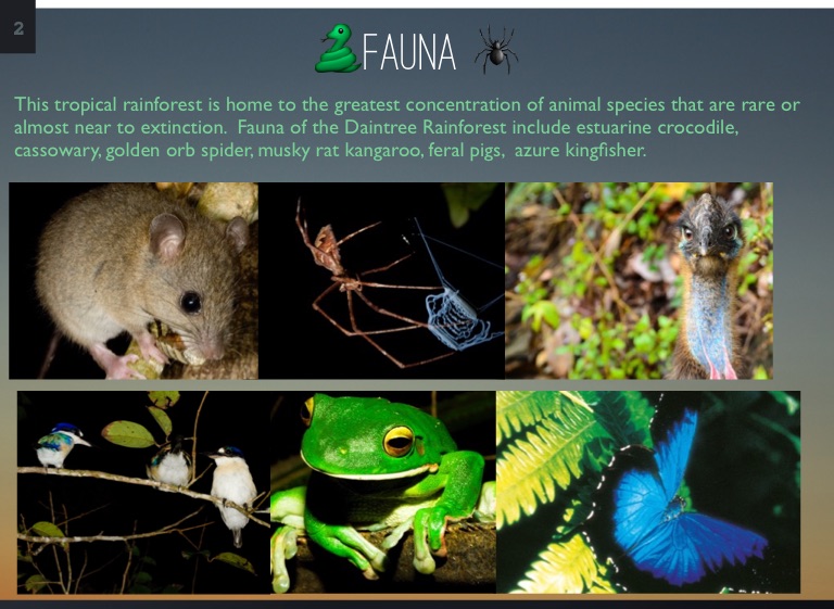 This tropical rainforest is home to the greatest concentration of animal species that are rare or almost near to extinction. Fauna of the Daintree Rainforest include estuarine crocodile, cassowary, golden orb spider, musky rat kangaroo, feral pigs, azure kingfisher.