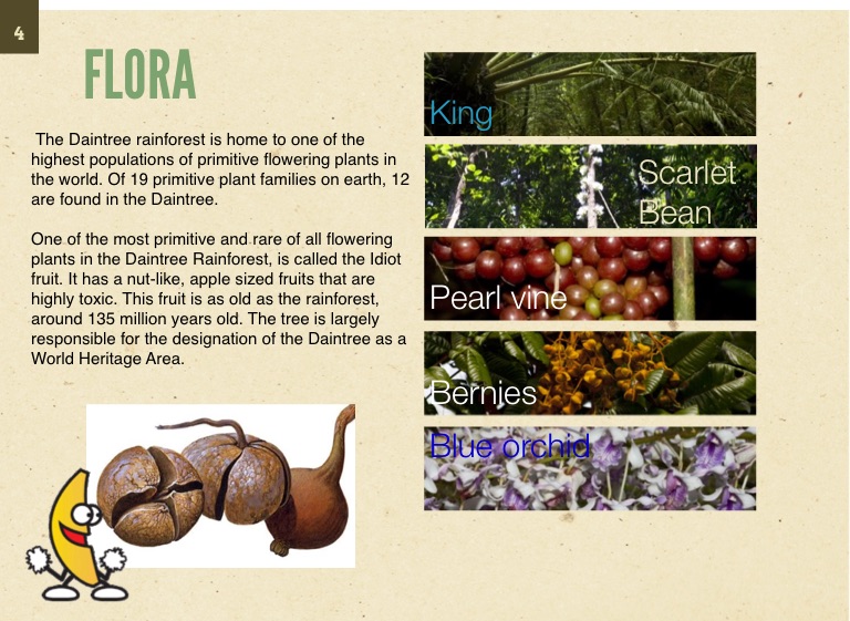 One of the most primitive and rare of all flowering plants in the Daintree Rainforest, is called the Idiot fruit. It has a nut-like, apple sized fruits that are highly toxic. This fruit is as old as the rainforest, around 135 million years old. The tree is largely responsible for the designation of the Daintree as a World Heritage Area.
