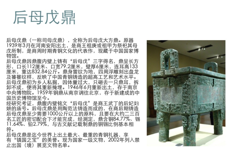 后母戊鼎是迄今世界上出土最大、最重的青铜礼器,享有“镇国之宝”的美誉。现为国家一级文物,2002年列入禁止出国(境)展览文物名单。