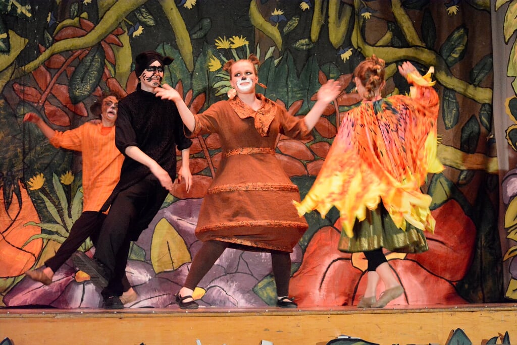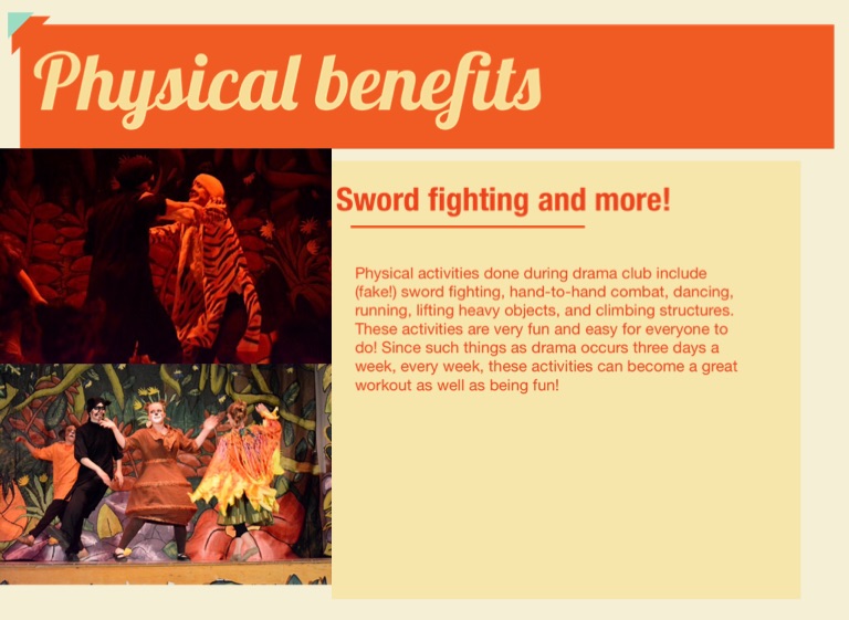 Physical activities done during drama club include (fake!) sword fighting, hand-to-hand combat, dancing, running, lifting heavy objects, and climbing structures. These activities are very fun and easy for everyone to do! Since such things as drama occurs three days a week, every week, these activities can become a great workout as well as being fun!