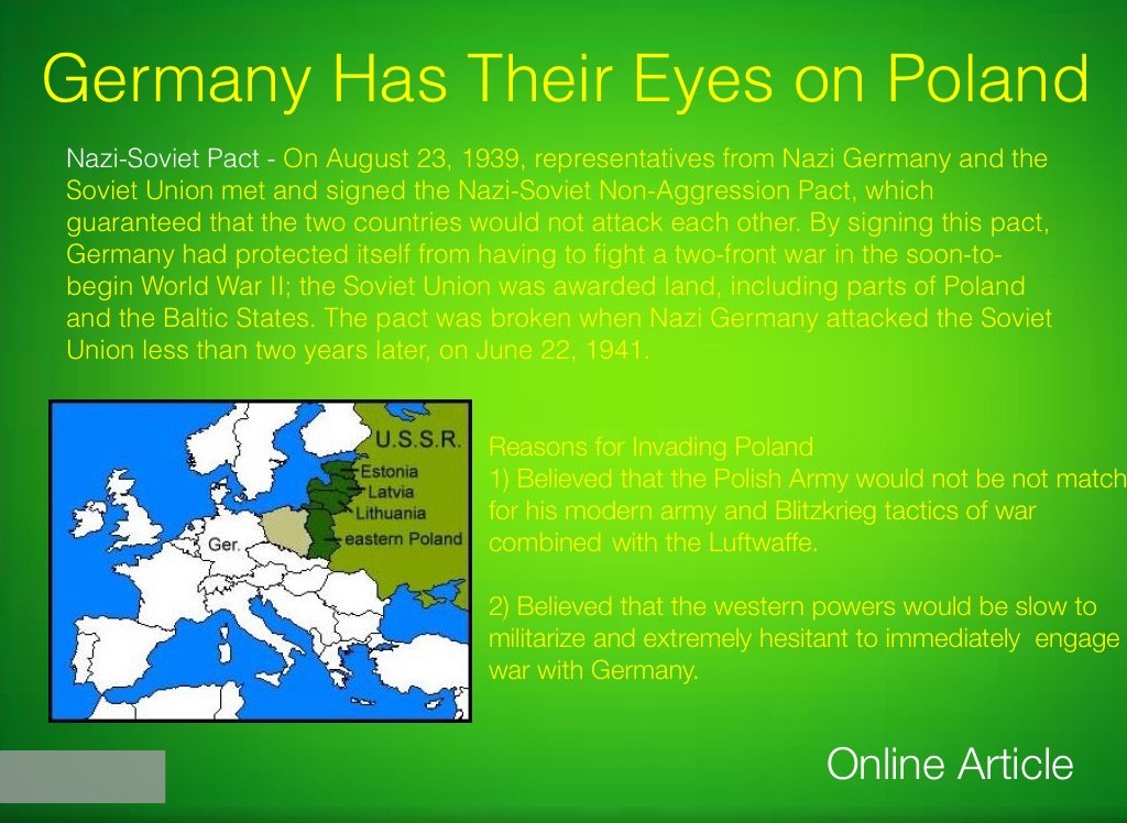 Nazi-Soviet Pact - On August 23, 1939, representatives from Nazi Germany and the Soviet Union met and signed the Nazi-Soviet Non-Aggression Pact, which guaranteed that the two countries would not attack each other. By signing this pact, Germany had protected itself from having to fight a two-front war in the soon-to-begin World War II; the Soviet Union was awarded land, including parts of Poland and the Baltic States. The pact was broken when Nazi Germany attacked the Soviet Union less than two years later, on June 22, 1941.