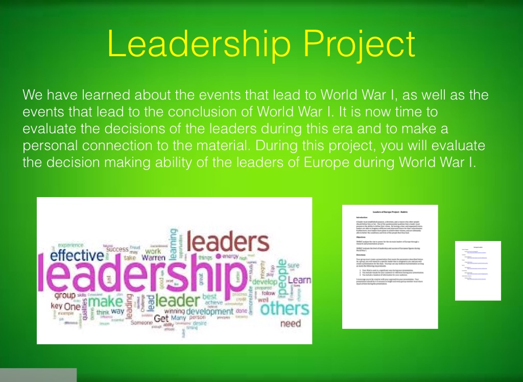 We have learned about the events that lead to World War I, as well as the events that lead to the conclusion of World War I. It is now time to evaluate the decisions of the leaders during this era and to make a personal connection to the material. During this project, you will evaluate the decision making ability of the leaders of Europe during World War I.
