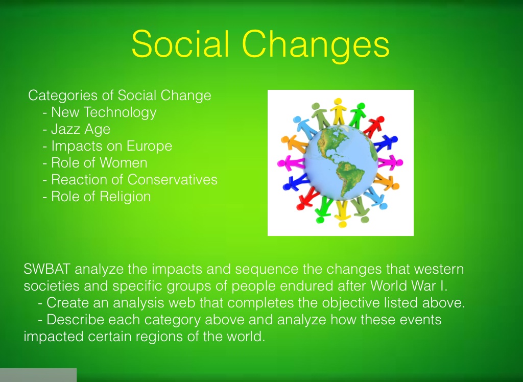 SWBAT analyze the impacts and sequence the changes that western societies and specific groups of people endured after World War I.