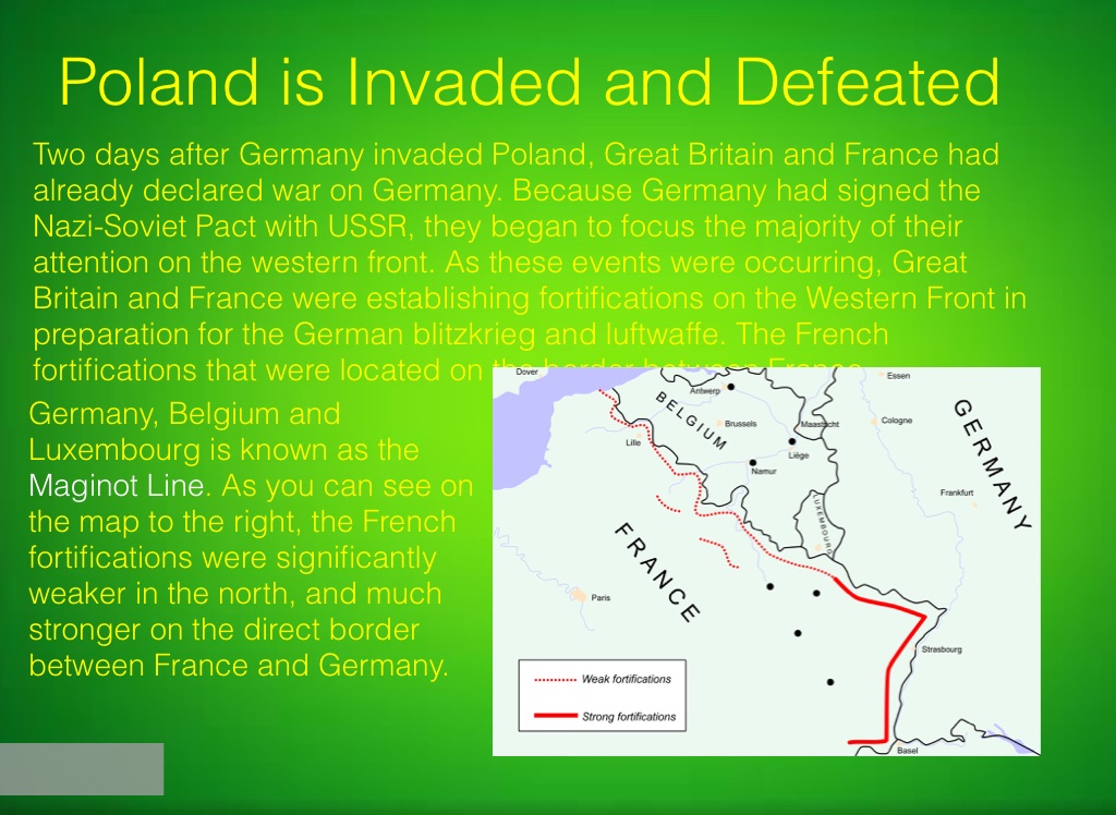 Two days after Germany invaded Poland, Great Britain and France had already declared war on Germany. Because Germany had signed the Nazi-Soviet Pact with USSR, they began to focus the majority of their attention on the western front. As these events were occurring, Great Britain and France were establishing fortifications on the Western Front in preparation for the German blitzkrieg and luftwaffe. The French fortifications that were located on the border between France