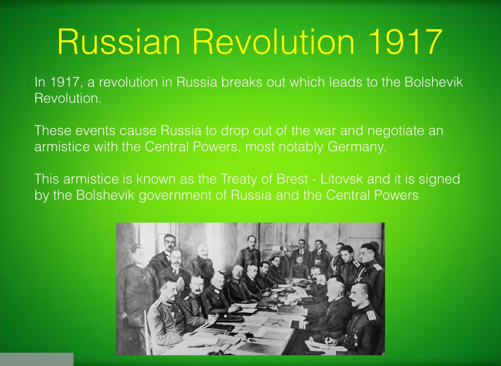 These events cause Russia to drop out of the war and negotiate an armistice with the Central Powers, most notably Germany.