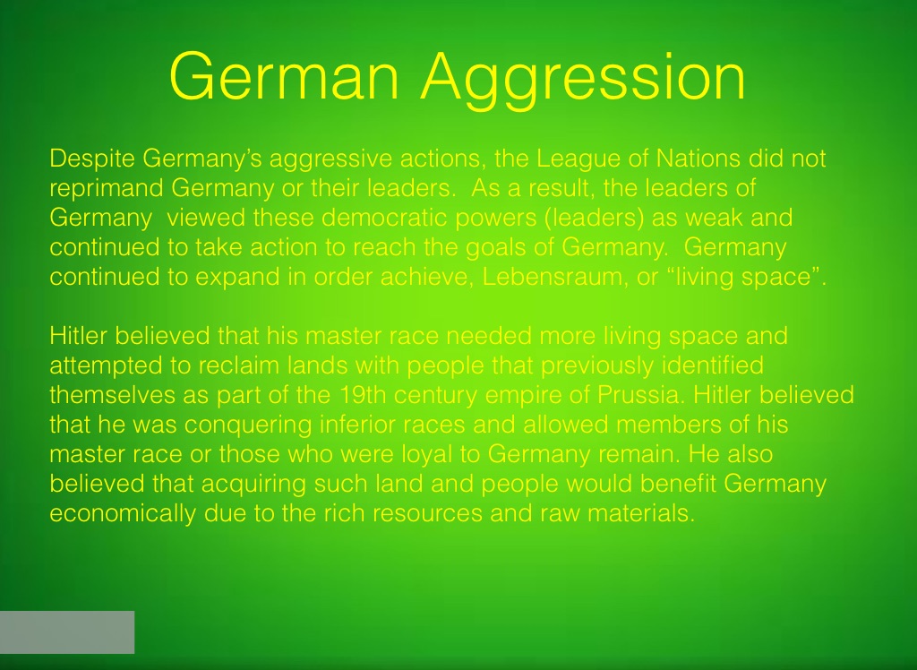 Despite Germany’s aggressive actions, the League of Nations did not reprimand Germany or their leaders. As a result, the leaders of Germany viewed these democratic powers (leaders) as weak and continued to take action to reach the goals of Germany. Germany continued to expand in order achieve, Lebensraum, or “living space”.