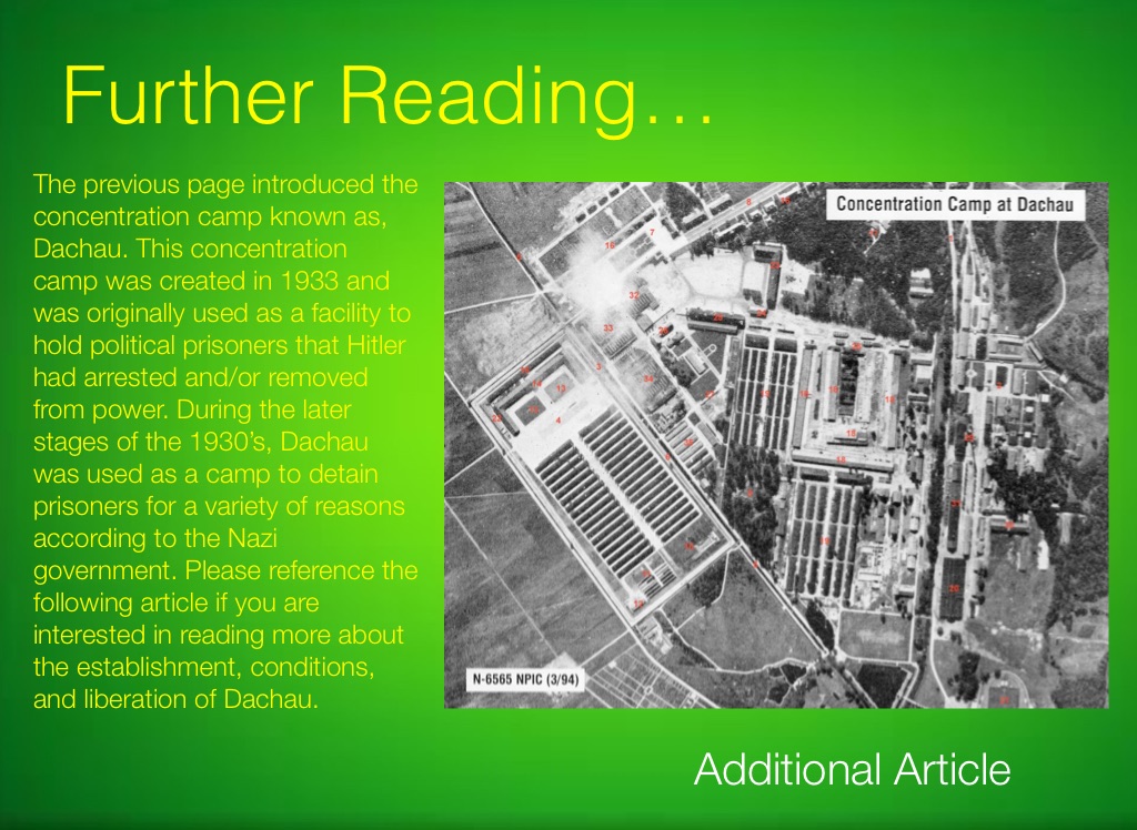 The previous page introduced the concentration camp known as, Dachau. This concentration camp was created in 1933 and was originally used as a facility to hold political prisoners that Hitler had arrested and/or removed from power. During the later stages of the 1930’s, Dachau was used as a camp to detain prisoners for a variety of reasons according to the Nazi government. Please reference the following article if you are interested in reading more about the establishment, conditions, and liberation of Dachau.