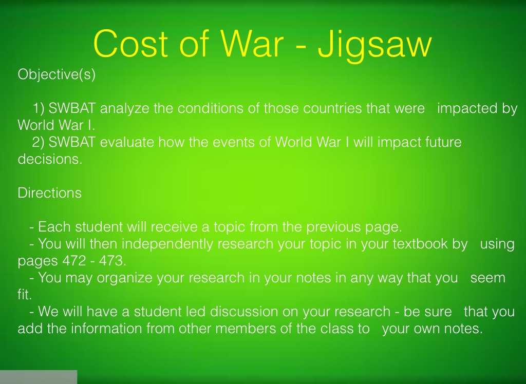 2) SWBAT evaluate how the events of World War I will impact future decisions.