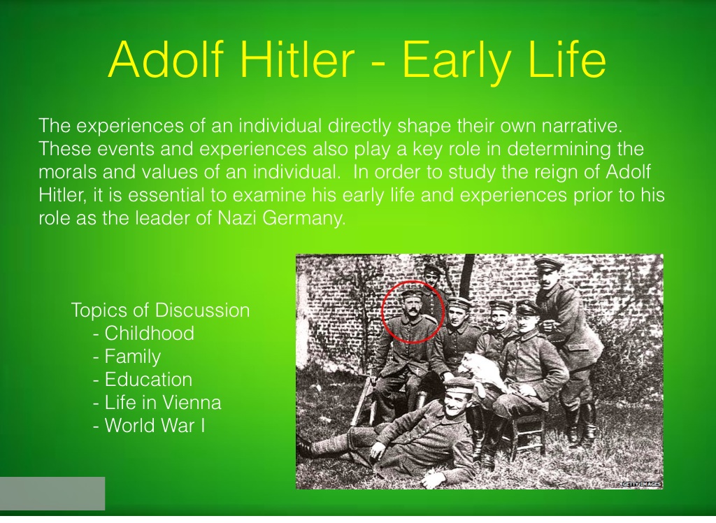 The experiences of an individual directly shape their own narrative. These events and experiences also play a key role in determining the morals and values of an individual. In order to study the reign of Adolf Hitler, it is essential to examine his early life and experiences prior to his role as the leader of Nazi Germany.