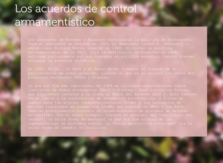 Los sucesores de Kennedy y Kruschev continuarán la política de distensión. Tras el asesinato de Kennedy en 1963, el demócrata Lyndon B. Johnson y el republicano Richard Nixon, elegido en 1968. dirigirán la política norteamericana; en la URSS, tras la destitución de Kruschev en 1964, motivada parcialmente por sus fracasos en política exterior, Leonid Breznev dirigirá la potencia soviética.
