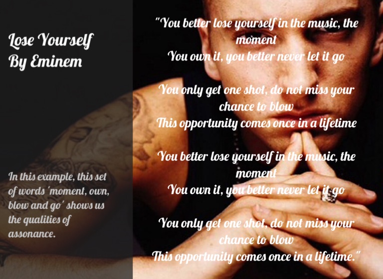 In this example, this set of words 'moment, own, blow and go' shows us the qualities of assonance.
