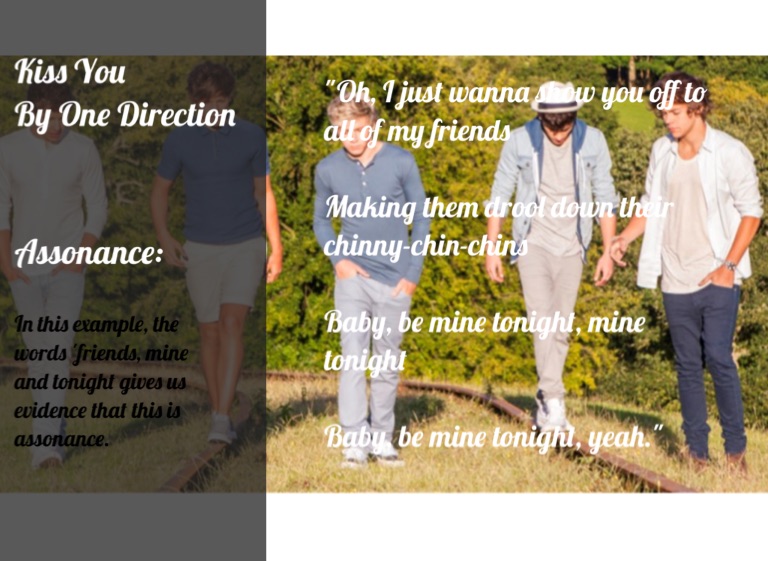 In this example, the words 'friends, mine and tonight gives us evidence that this is assonance.