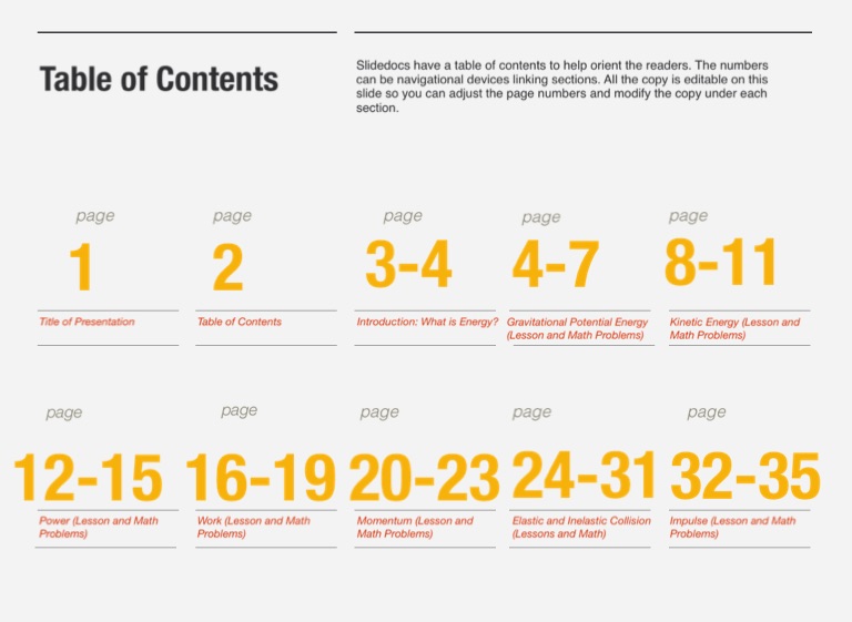 Slidedocs have a table of contents to help orient the readers. The numbers