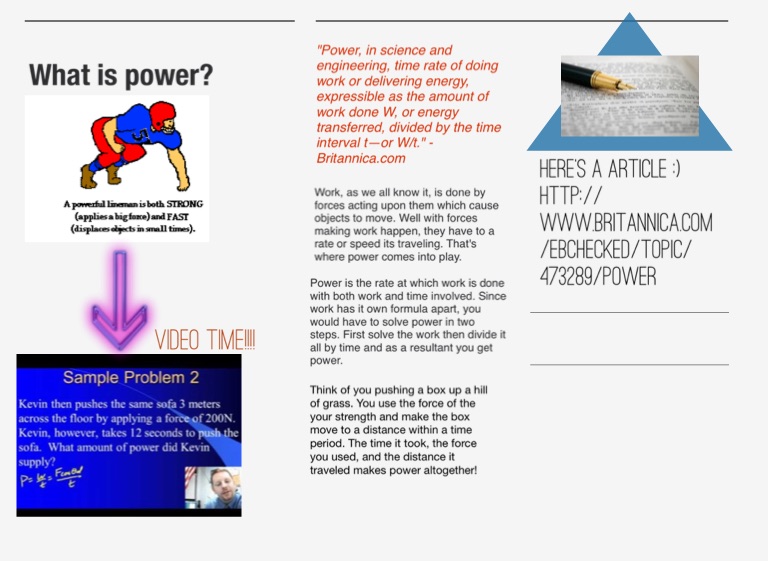 Think of you pushing a box up a hill of grass. You use the force of the your strength and make the box move to a distance within a time period. The time it took, the force you used, and the distance it traveled makes power altogether!