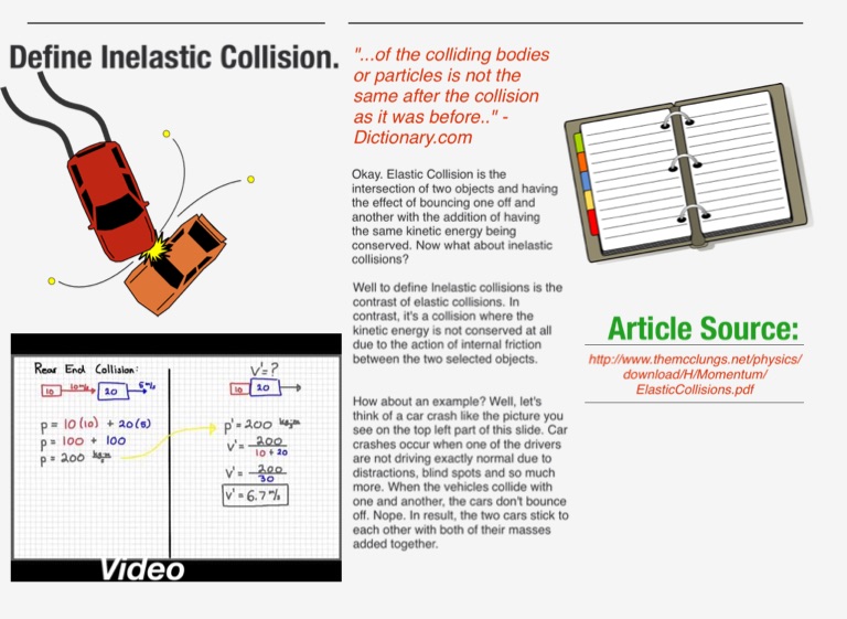 Okay. Elastic Collision is the intersection of two objects and having the effect of bouncing one off and another with the addition of having the same kinetic energy being conserved. Now what about inelastic collisions?