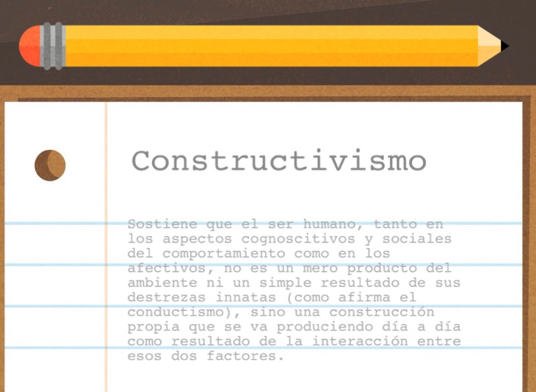 Sostiene que el ser humano, tanto en los aspectos cognoscitivos y sociales del comportamiento como en los afectivos, no es un mero producto del ambiente ni un simple resultado de sus destrezas innatas (como afirma el conductismo), sino una construcción propia que se va produciendo día a día como resultado de la interacción entre esos dos factores.