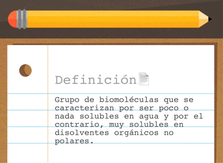 Grupo de biomoléculas que se caracterizan por ser poco o nada solubles en agua y por el contrario, muy solubles en disolventes orgánicos no polares.