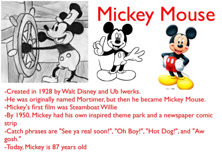 -Created in 1928 by Walt Disney and Ub Iwerks.