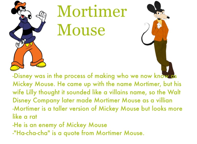-Disney was in the process of making who we now know as Mickey Mouse. He came up with the name Mortimer, but his wife Lilly thought it sounded like a villains name, so the Walt Disney Company later made Mortimer Mouse as a villian