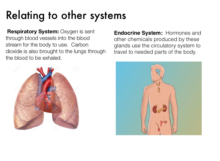 Respiratory System: Oxygen is sent through blood vessels into the blood stream for the body to use. Carbon dioxide is also brought to the lungs through the blood to be exhaled.