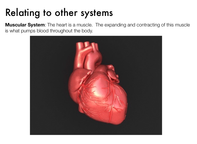 Muscular System: The heart is a muscle. The expanding and contracting of this muscle is what pumps blood throughout the body.