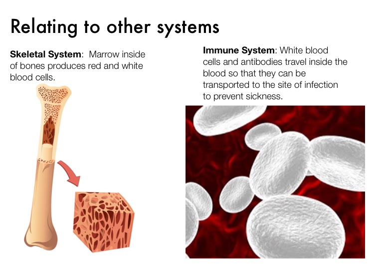 Skeletal System: Marrow inside of bones produces red and white blood cells.