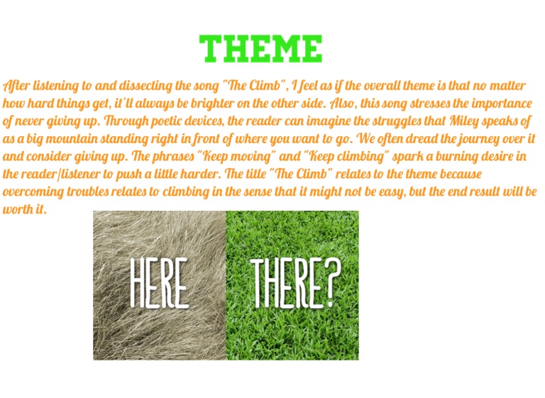 After listening to and dissecting the song "The Climb", I feel as if the overall theme is that no matter how hard things get, it'll always be brighter on the other side. Also, this song stresses the importance of never giving up. Through poetic devices, the reader can imagine the struggles that Miley speaks of as a big mountain standing right in front of where you want to go. We often dread the journey over it and consider giving up. The phrases "Keep moving" and "Keep climbing" spark a burning desire in the reader/listener to push a little harder. The title "The Climb" relates to the theme because overcoming troubles relates to climbing in the sense that it might not be easy, but the end result will be worth it.