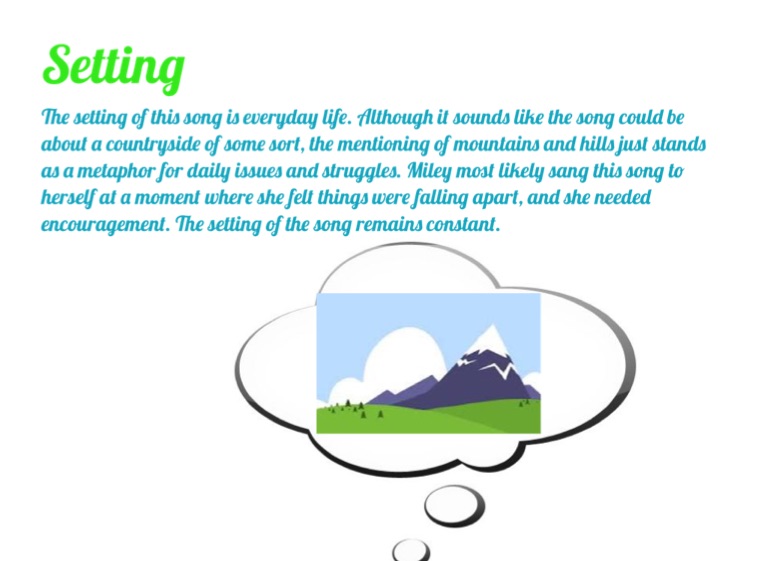 The setting of this song is everyday life. Although it sounds like the song could be about a countryside of some sort, the mentioning of mountains and hills just stands as a metaphor for daily issues and struggles. Miley most likely sang this song to herself at a moment where she felt things were falling apart, and she needed encouragement. The setting of the song remains constant.