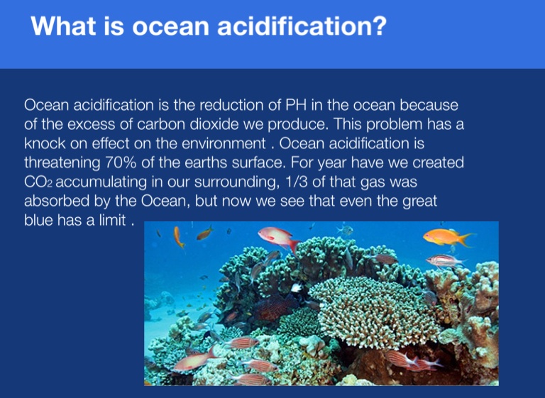 Ocean acidification is the reduction of PH in the ocean because of the excess of carbon dioxide we produce. This problem has a knock on effect on the environment . Ocean acidification is threatening 70% of the earths surface. For year have we created CO2 accumulating in our surrounding, 1/3 of that gas was absorbed by the Ocean, but now we see that even the great blue has a limit .