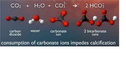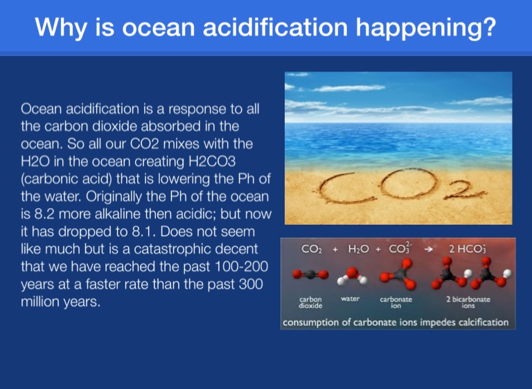Ocean acidification is a response to all the carbon dioxide absorbed in the ocean. So all our CO2 mixes with the H2O in the ocean creating H2CO3 (carbonic acid) that is lowering the Ph of the water. Originally the Ph of the ocean is 8.2 more alkaline then acidic; but now it has dropped to 8.1. Does not seem like much but is a catastrophic decent that we have reached the past 100-200 years at a faster rate than the past 300 million years.