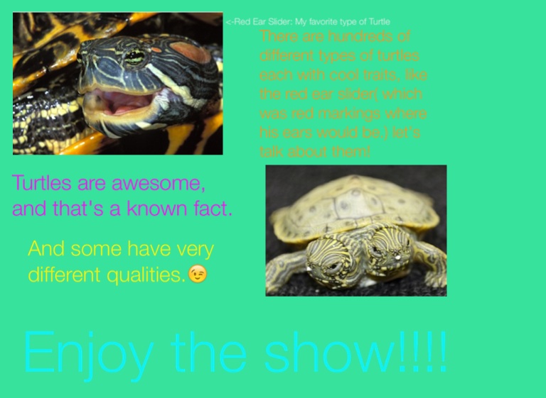 There are hundreds of different types of turtles each with cool traits, like the red ear slider( which was red markings where his ears would be.) let's talk about them!
