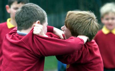 Liesel beau Ludwig up on the playground. Ludwig always teases liesel about how she can't read.