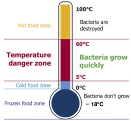 Danger Zone- temp easiest for harmful bacteria is between 5 degrees Celsius and 60 degrees Celsius