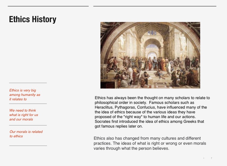 Ethics has always been the thought on many scholars to relate to philosophical order in society. Famous scholars such as Heraclitus, Pythagoras, Confucius, have influenced many of the the idea of ethics because of the various ideas they have proposed of the "right way" to human life and our actions. Socrates first introduced the idea of ethics among Greeks that got famous replies later on.