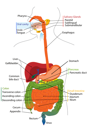 - Major organs: mouth, esophagus, stomach, small intestine, liver, pancreas, large intestine, rectum, and anus