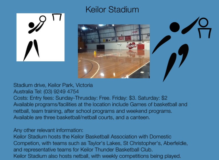 Keilor Stadium hosts the Keilor Basketball Association with Domestic Competion, with teams such as Taylor's Lakes, St Christopher's, Aberfeldie, and representative teams for Keilor Thunder Basketball Club.
