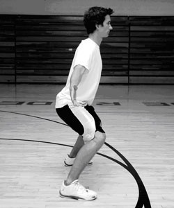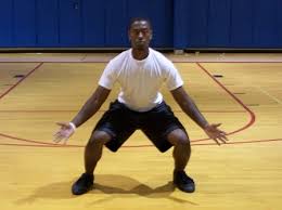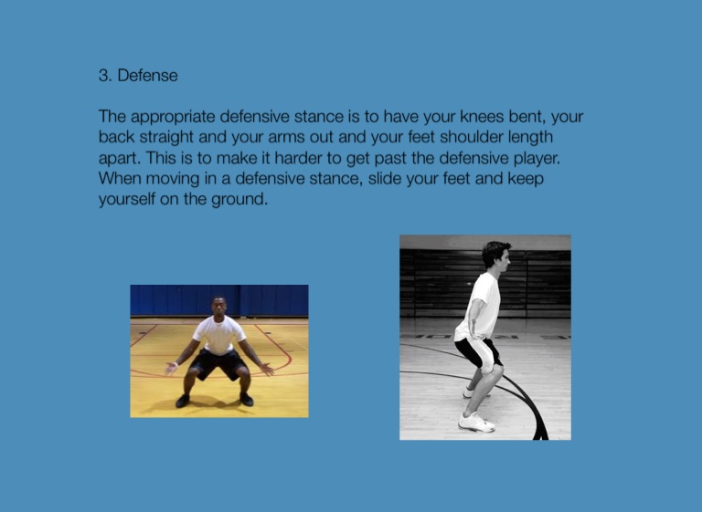 The appropriate defensive stance is to have your knees bent, your back straight and your arms out and your feet shoulder length apart. This is to make it harder to get past the defensive player. When moving in a defensive stance, slide your feet and keep yourself on the ground.