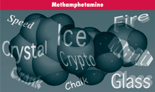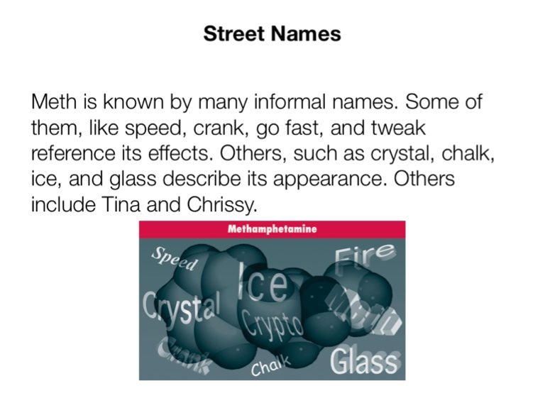 Meth is known by many informal names. Some of them, like speed, crank, go fast, and tweak reference its effects. Others, such as crystal, chalk, ice, and glass describe its appearance. Others include Tina and Chrissy.